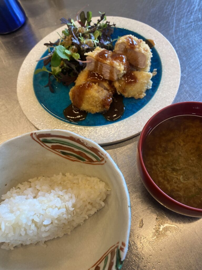 本日のまかないは、昼に用意しておいた ヒレカツとサラダ、ごはんに味噌汁の定番セット。